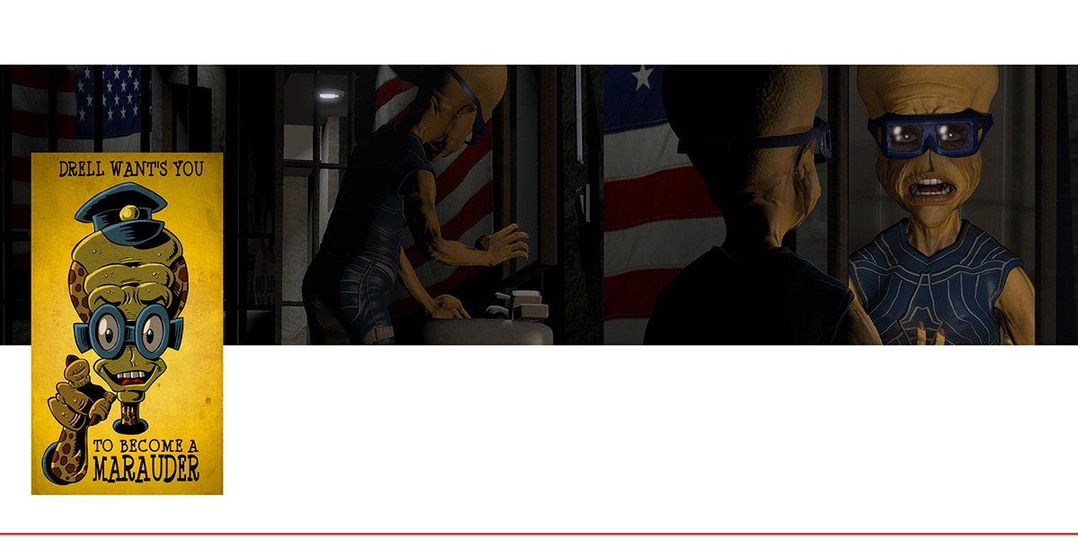 Our first unpublished experiment in utilising CGI, where we were seeking to originate an interesting visual cross-over between hand drawn material and that which is computer generated... 'Drell', existing within a 2D comic-book reality, suddenly finds himself to be stranded within a strange 3D reality. Small beginnings, but it did bring about something of a sea-change, a substantial alteration to our perspective, re ongoing creative output.